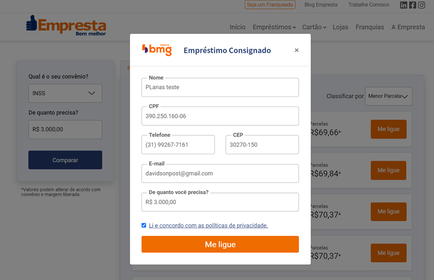 4- Em seguida, preencha com suas informações os campos “Nome”, “CPF”, “Telefone”, “CEP”, “E-mail” e “De quanto precisa?”, depois de preencher todos os campos clique em “Me ligue”.